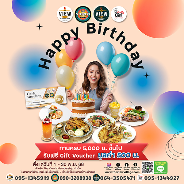 ลูกค้าใช้บริการกับทางร้านทั้ง 4 สาขา ตรงกับวันเกิด รับ GIFT VOUCHER 500 บาท เมื่อทานครบ 5,000 บาท