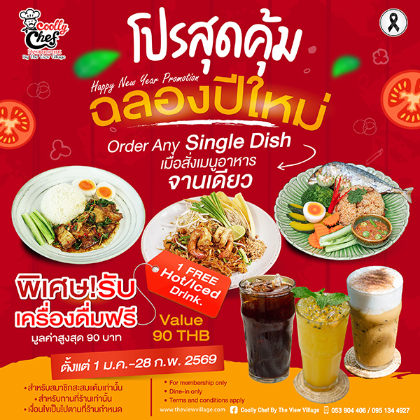 ร้าน Coolly Chef [แม่เหียะ] ร่วมฉลองปีใหม่ ฟรีเครื่องดื่มร้อนหรือเย็น เมื่อสั่งเมนูอาหารจานเดียว ตลอดเดือน มกราคม-กุมภาพันธ์ 69 นี้
