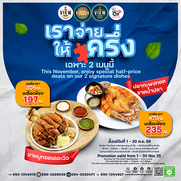พิเศษสุดตลอดเดือน พฤศจิกายน 68 เราจ่ายให้ครึ่ง 2 เมนูเด็ด ขาหมูทอดเดอะวิว และ ปลากะพงทอดราดน้ำปลา ทุกร้าน 4 สาขา